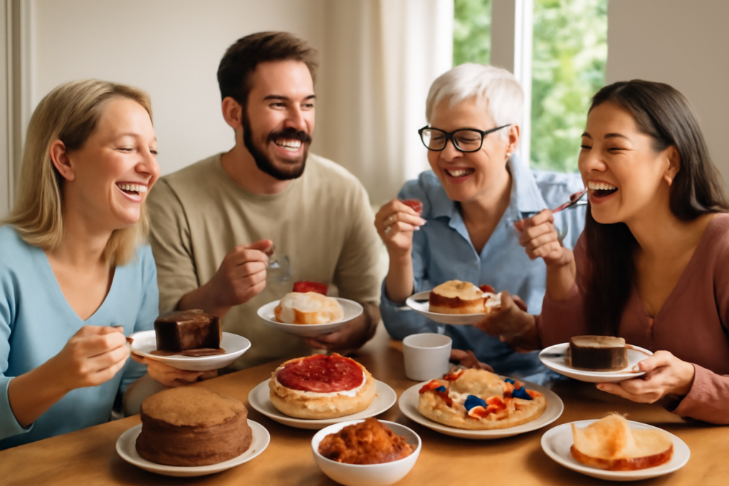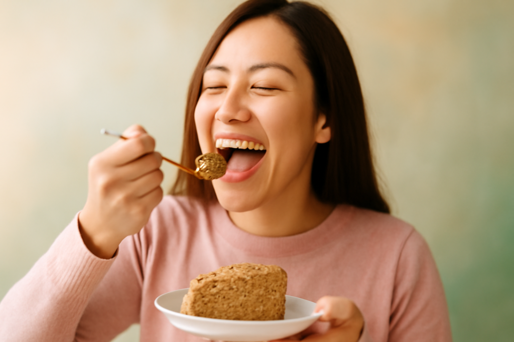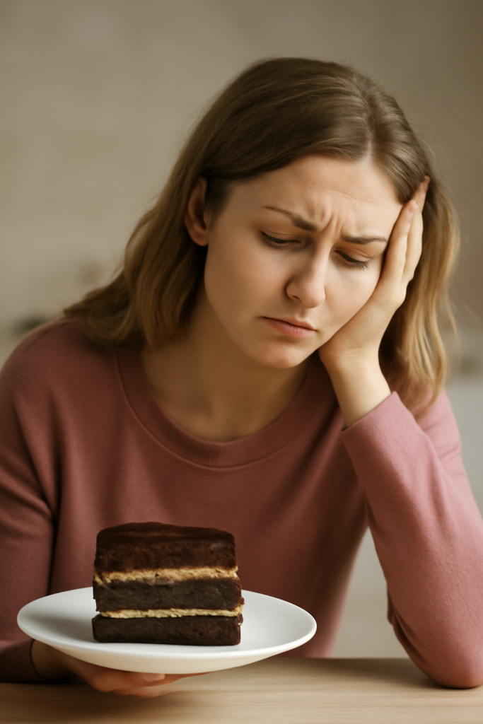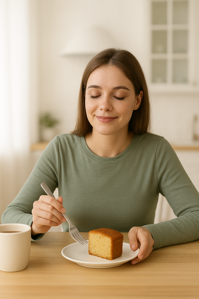 No café da manhã, o bolo não é mais inimigo: é um bolo fofinho, cheiroso, feito com ingredientes leves.  Come devagar, apreciando o sabor, com a tranquilidade de saber que aquilo faz parte do processo do bem estar, não é um “erro”. Ao longo do dia, a mente fica mais calma: acabam os ataques desesperados ao armário, a fome descontrolada no fim da tarde e o pensamento obsessivo “estraguei tudo de novo”. Ela tem opções prontas, sabe o que pode comer, sente energia para trabalhar cuidar da casa e da família.
